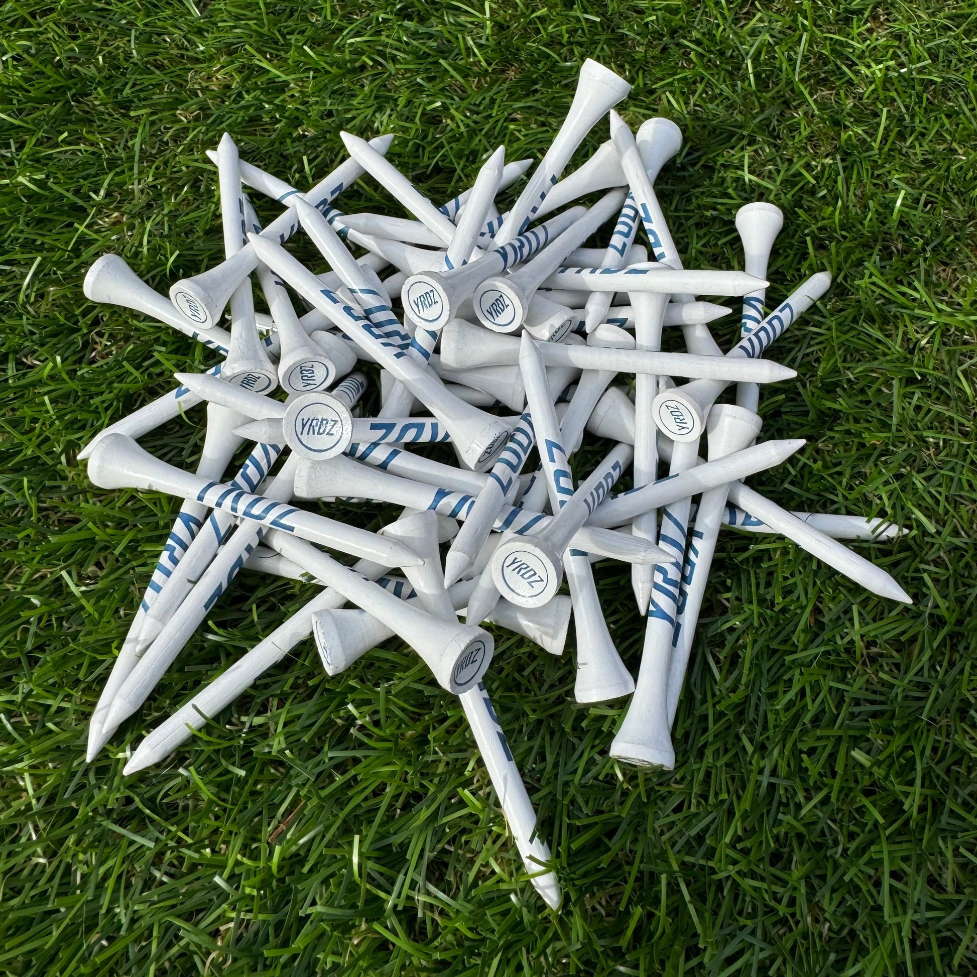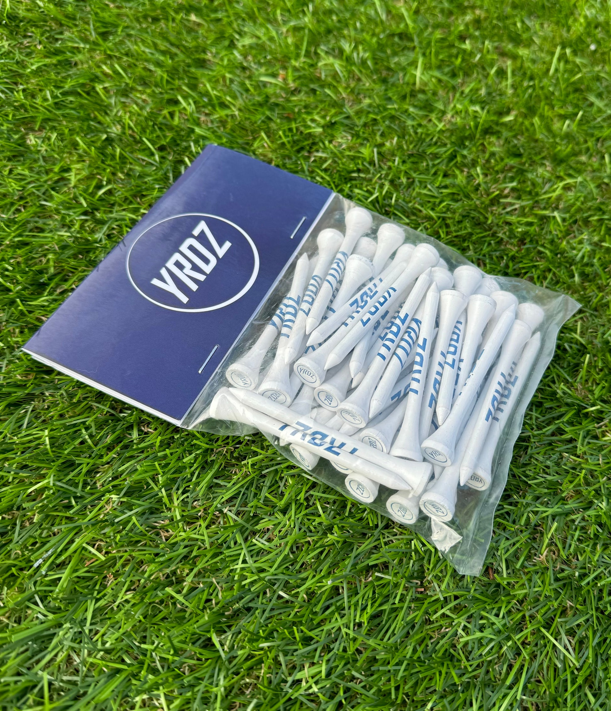1 x pack of 50 YRDZ branded wooden golf tees. YRDZ in the cup, YRDZ on the shaft. 70mm.